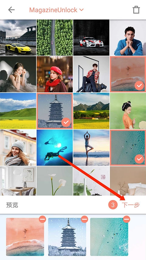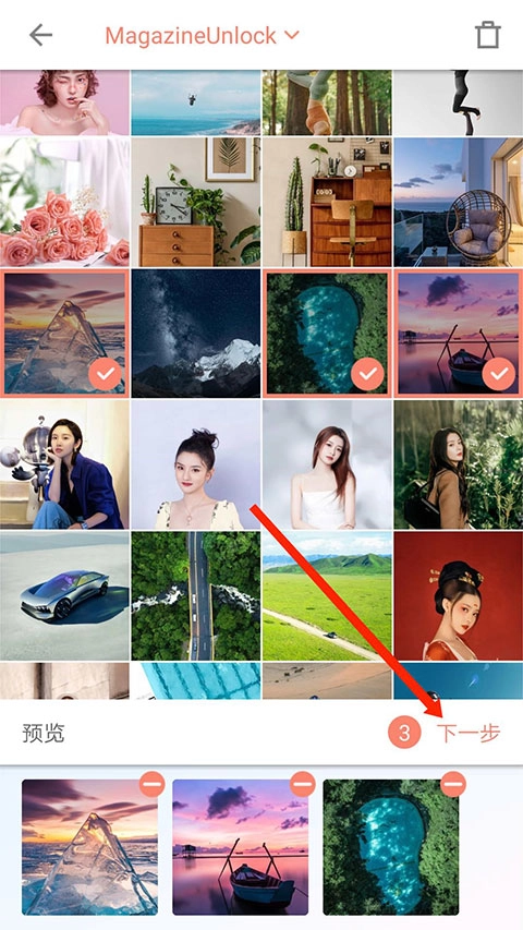 接下来,用户需要挑选需要拼接的图片,选好之后点击“下一步”按钮,就能进入无缝图片效果的设置环节了。