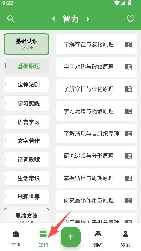 1、打开应用后点击“知识”板块,进入知识页面后,点击页面下方的加号按钮来切换分类。