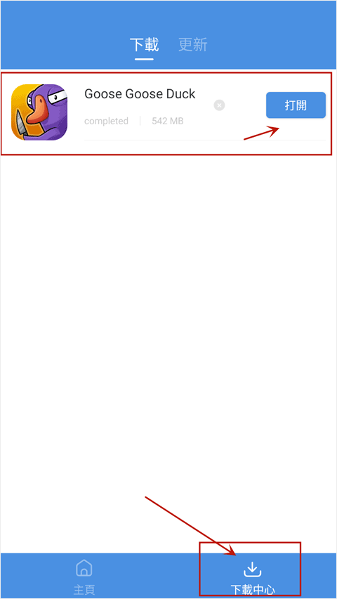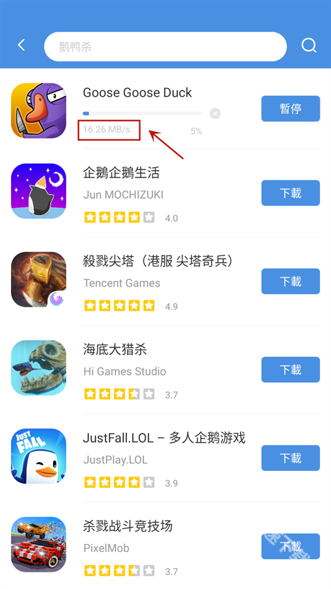 这里就拿近期热度很高的鹅鸭杀游戏来举例,在顶部的搜索框里输入“鹅鸭杀”,就能在下方看到这款游戏的评分和厂商相关信息,点击一键操作就可以了。