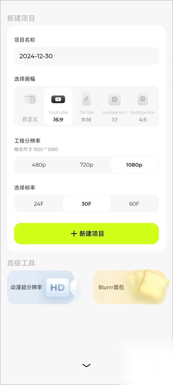 2、选定画幅、工程分辨率、帧率等参数,随后创建新项目;
