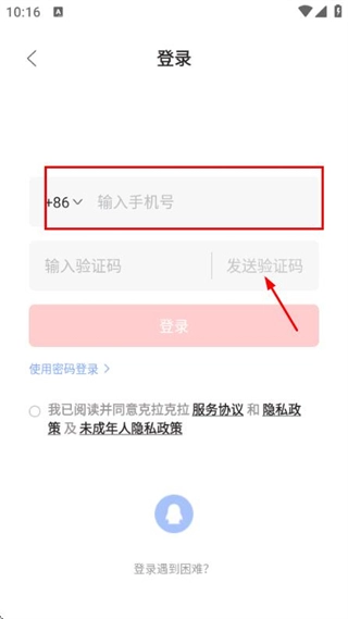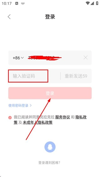 3、在验证码输入框内填入收到的验证码,点击登录按钮以完成账号登录流程。