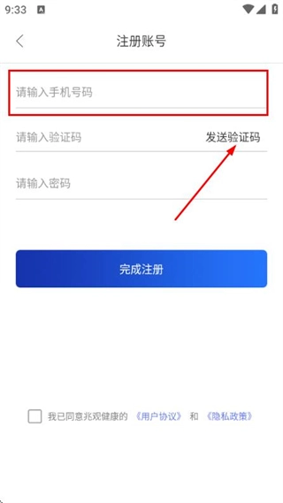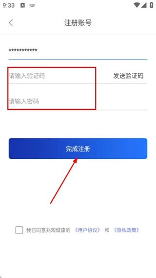 3、在账号注册页面输入验证码与密码,勾选相关协议后,点击完成注册按钮,即可完成账号注册流程。