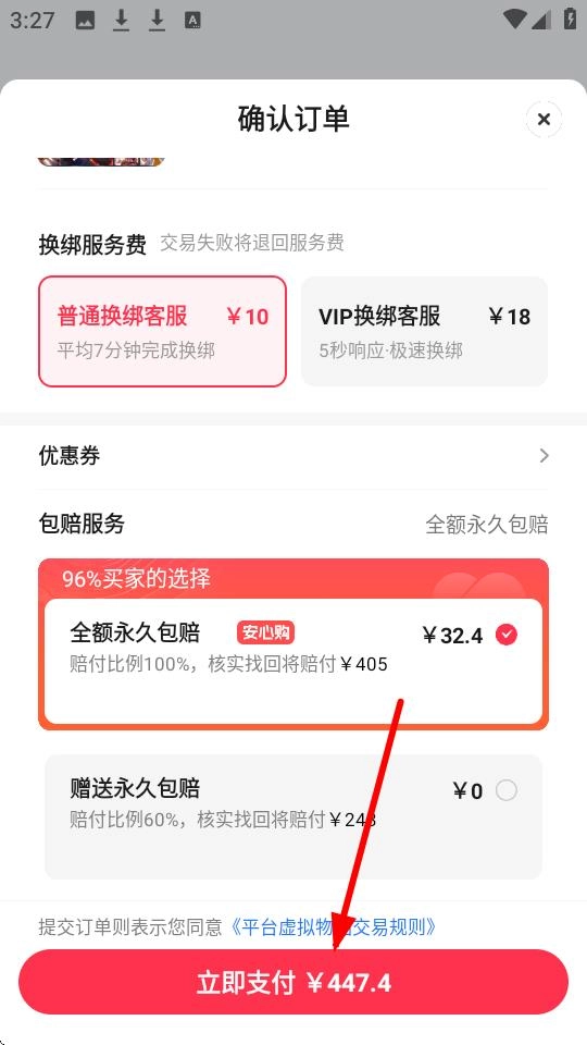 在确认订单的环节,你可以选择【普通换绑客服】或者【VIP换绑客服】,系统还会推荐包赔服务等选项,选好之后点击“立即支付”即可。