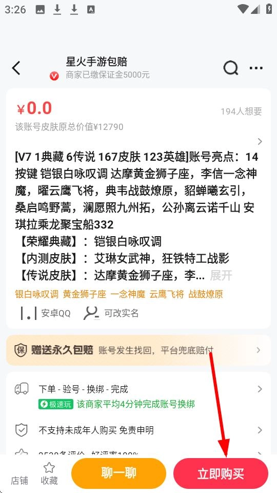 2、当你在【星火包赔】店铺发现了心仪的账号,点击【立即购买】按钮就能进入后续的操作流程。