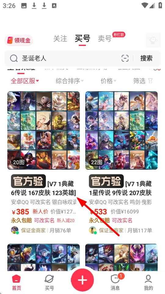 1、在买号页面,挑选标注有【v71典藏6传说167皮肤123英雄】这类信息的账号进行选购。