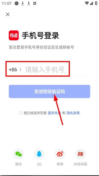 3、进入【手机号登录】界面后,先在【请输入手机号】的输入框中填写手机号,勾选同意相关条款,再点击【发送短信验证码】按钮。