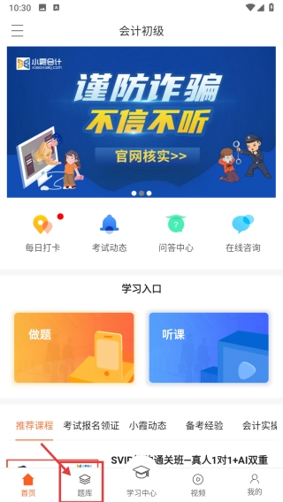 1、进入会计学习类应用或网站首页后,点击底部导航栏中的“题库”选项,即可进入题库页面。