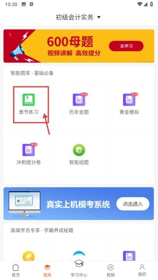 在题库页面,找到并点击“章节练习”选项,即可进入章节练习页面。