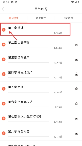 3、进入章节练习页面后,点击“第一章概述”选项,即可展开该章节的小节列表。