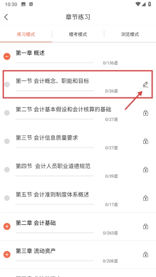 4、在小节列表里,点击第一节“会计概念、职能和目标”右侧的编辑图标,就能开展该小节的练习操作。
