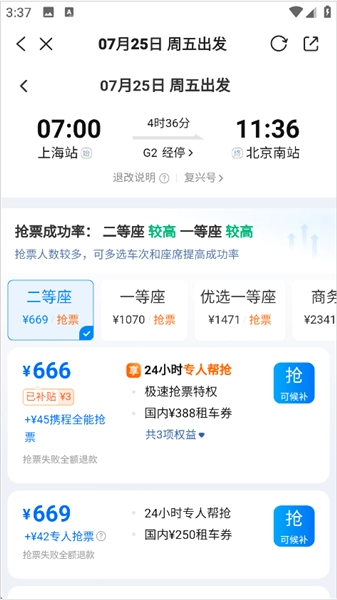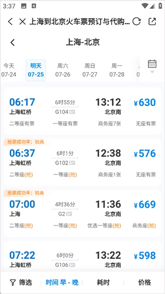 4、系统会呈现所有相关的车次,你可以依据自身的出行时间以及座位需求,挑选出合适的车次;