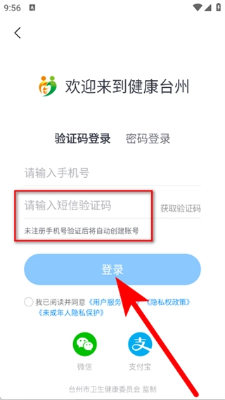4、输入短信验证码,勾选相关选项后,点击登录按钮,即可完成账号登录操作。