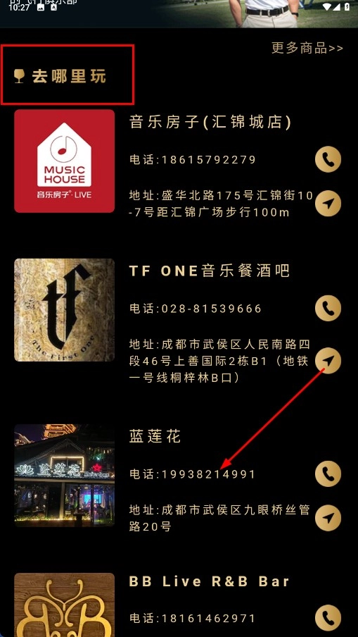 2、在场所列表中点击目标场所,即可查看该场所的电话、地址以及商家介绍等相关信息。