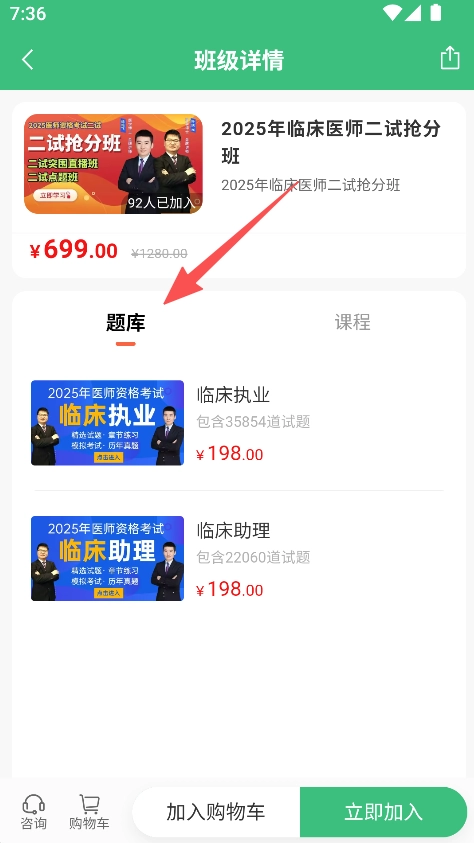 2、进入班级详情页面后,点击“题库”选项,接着选择对应的考试题库(例如临床助理题库)。
