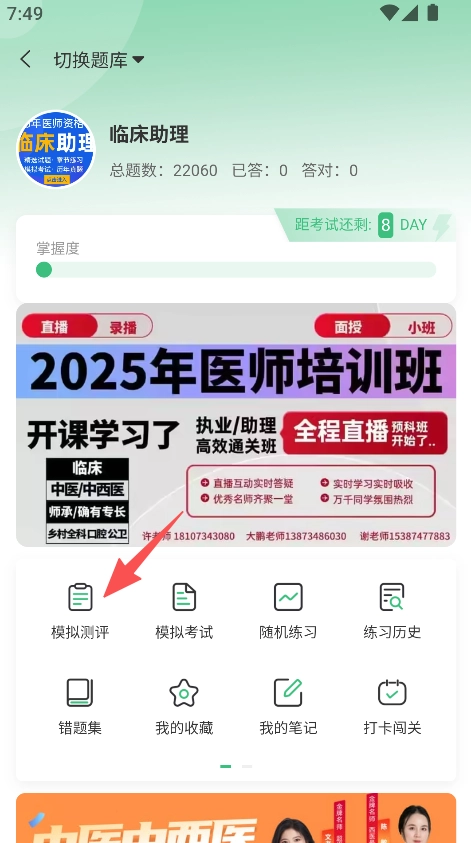 3、进入题库,点击模拟测评,开始刷题练习。