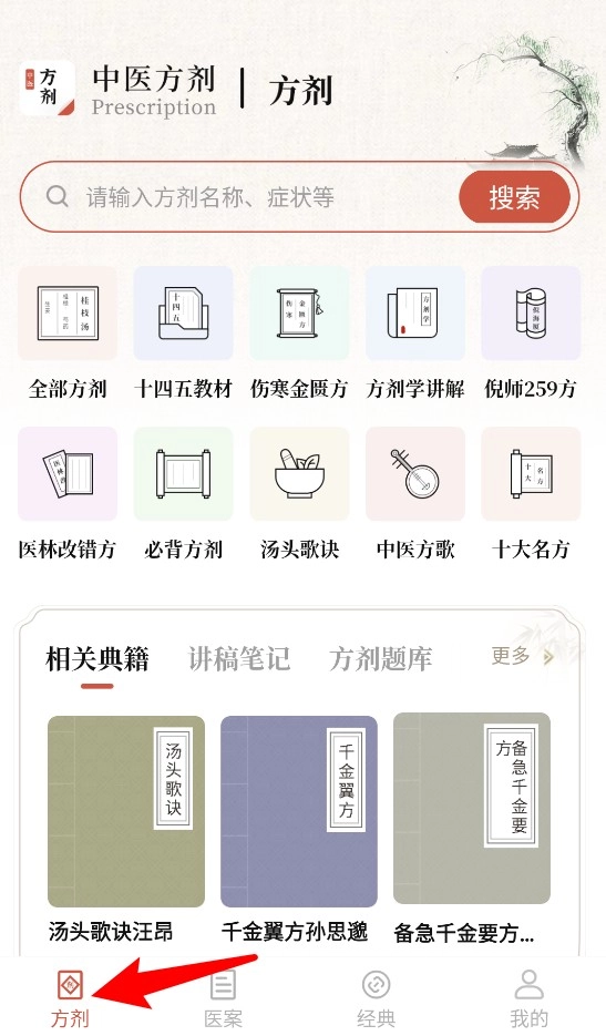 1、首页可以浏览各种推荐方剂及经典古籍,支持输入关键词搜索对应方剂和症状内容。