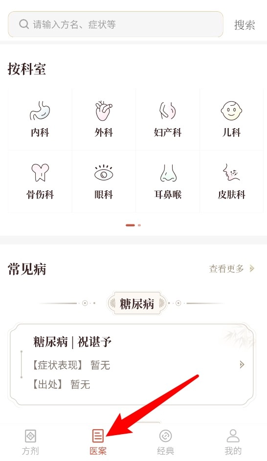 2、点击下方医案进入科室分类界面,支持按内外妇儿等多个科室查阅对应的中医医案。
