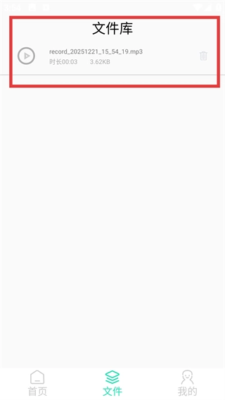 4、保存的录音会出现在【文件库】中,可查看录音时长、大小,支持播放或删除操作。