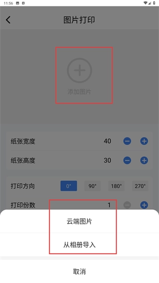 2、在【图片打印】页面,点击【添加图片】,选择【云端图片】或【从相册导入】的方式获取待打印图片。