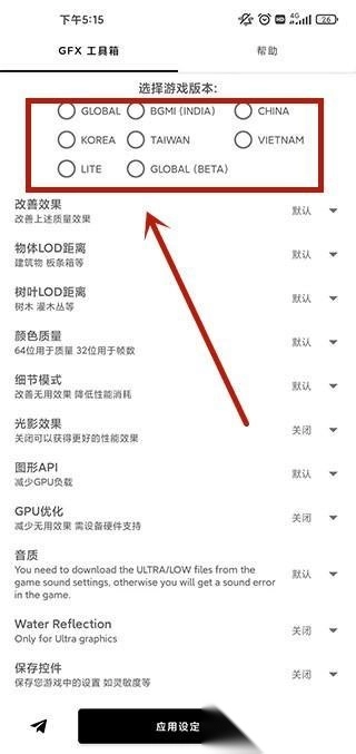 1、想要使用用gfx工具箱正版来提高pubg、地铁画质的话,大家需要先在主页的顶端选择不同的版本,其中包括有国际服、国服、韩服等八个版本,在选择后就能对画质进行自定义修改了。