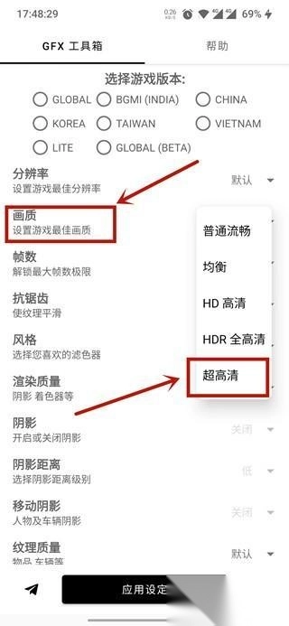 2、在调整画质时,最底部的“超高清”选项对应的画质是最高的,对自己手机性能有信心的用户可以优先选择这一选项。