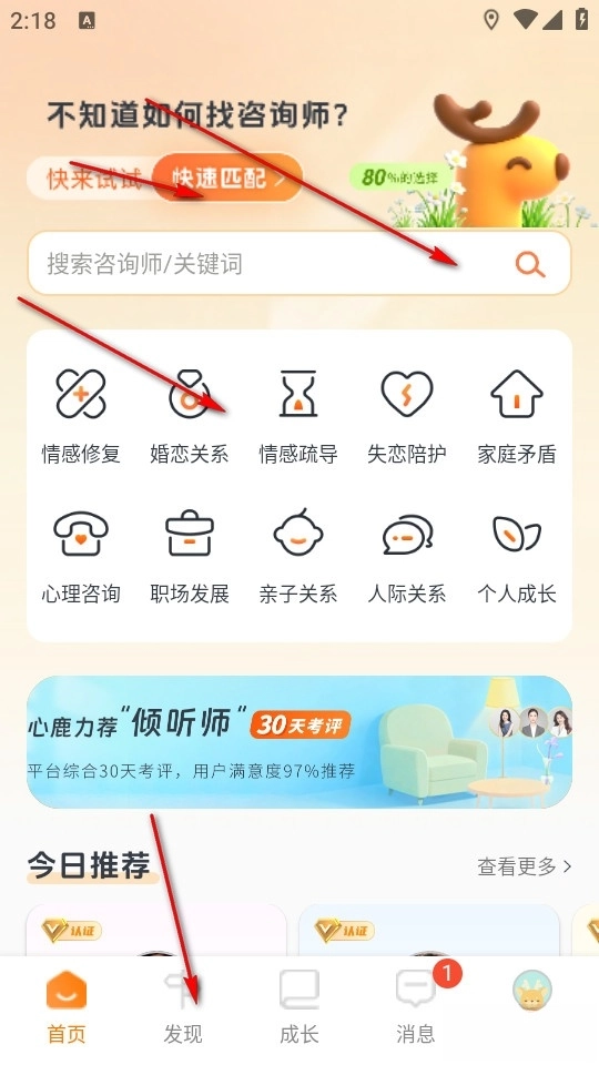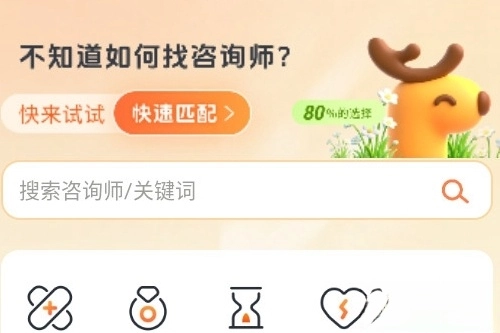 进入软件首页后,我们既可以选择快速匹配到合适的咨询师,也能通过搜索功能,或是依据自身情况去寻找不同分类下专属的心理咨询师。