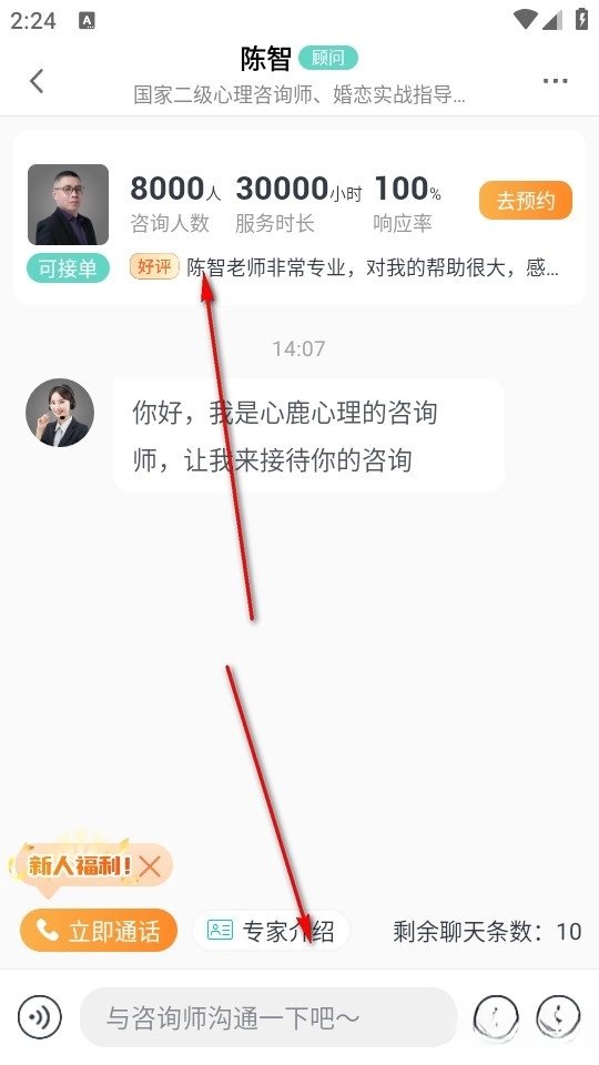 我们点击进入聊天界面,我们可以在聊天界面咨询相关问题,在下方我们也能了解相关的专家介绍,并且我们可以选择视频或者文字咨询。