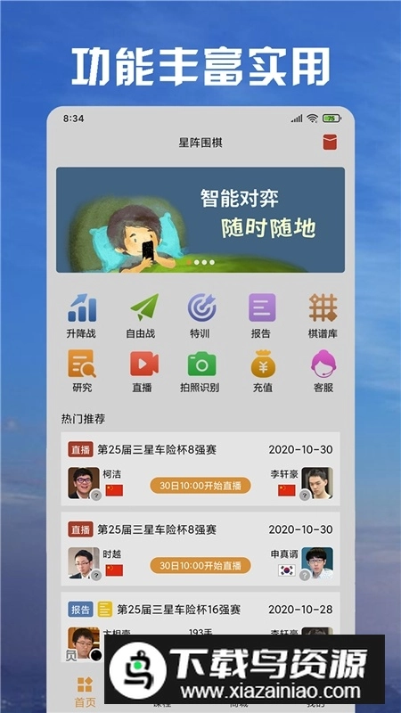 2.直播功能:热门赛事免费观看;拥有强大的后台资源支持;实时对比实战走法与推荐下法;通过图表展示胜率走势、发挥水平并标记问题手;历史直播可通过公开报告随时回看。