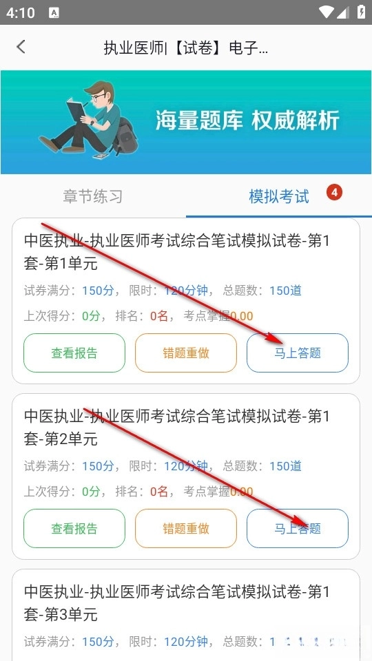 在模拟考试环节,挑选一套我们需要进行练习的模拟试卷,然后点击“开始答题”按钮。