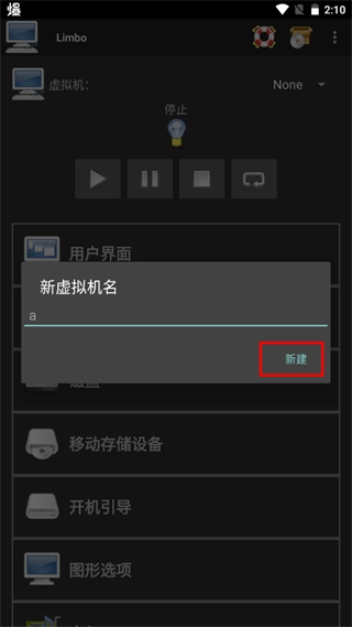 5、在弹出的窗口中输入你为新虚拟机配置设定的名称,名称可自行决定,不过建议简洁些,并且最好使用英文;这里以“a”作为示例。输入完成后,点击窗口右下角的“新建”按钮。