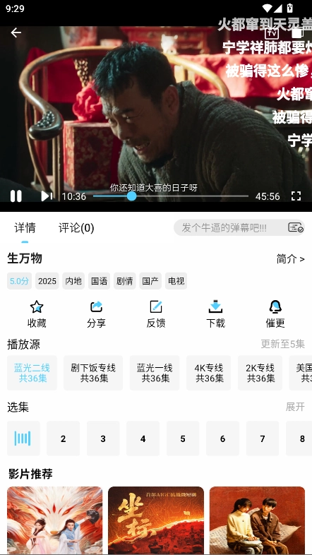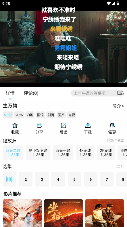 在详情页面能够看到,这款软件具备收藏、分享、催更、投屏、观看及发送弹幕等功能。