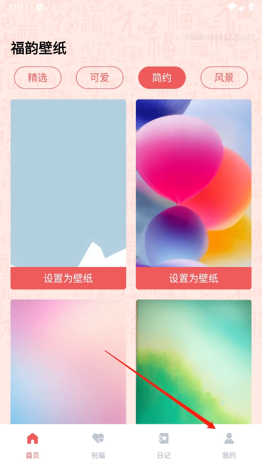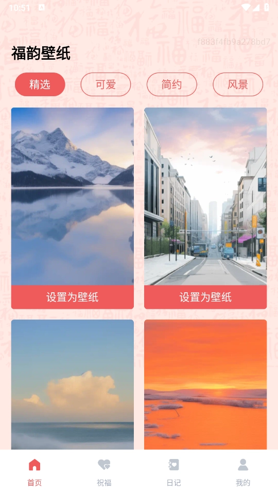 打开软件后,首页展示着丰富的壁纸资源分类,涵盖了精选、可爱、简约等多种不同类型。