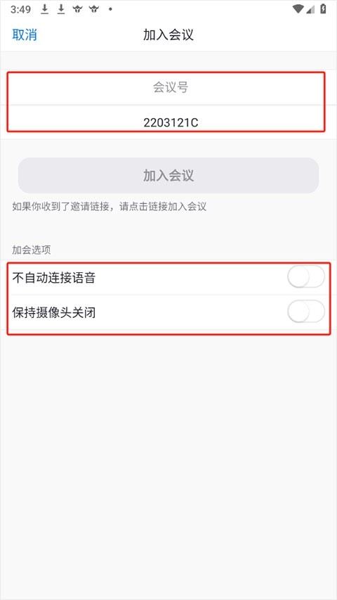 2、输入会议号与会议名称,下方还能选择是否开启摄像头