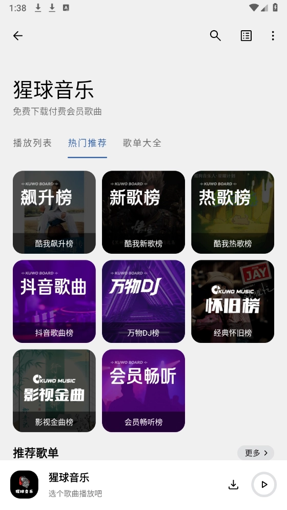 猩球音乐是一款能够免费听歌的应用,它拥有十分丰富的音乐曲库,不管是经典老歌还是当下流行的音乐都能在这里找到,而且平台上的每一首歌曲都可以免费收听,还提供多种不同音质的播放选择,用户无需开通会员就能尽情聆听,同时它也会及时同步收录各大知名音乐平台的曲库内容。