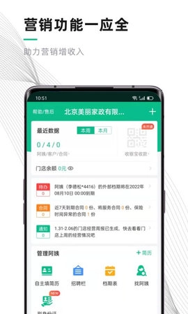 熊猫系统是北京小熊美家科技有限公司开发的商家管理软件,是一款专门面向家政公司的SaaS管理工具。该系统以互联网技术为优势,以整合家政资源为特色,为家政公司提供全方位赋能,助力家政行业实现“互联网+”升级。借助熊猫系统,家政公司能够随时随地在线管理客户,录入客户跟进记录与资料,从而提升客户管理效率;系统还具备添加合同、查看到期合同等功能,方便家政老师随时随地签订合同,有效提高签单效率。