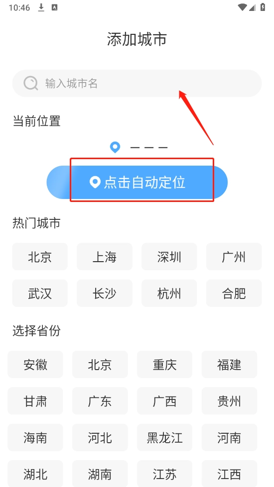 进入首页,通过搜索或者自动定位添加城市。