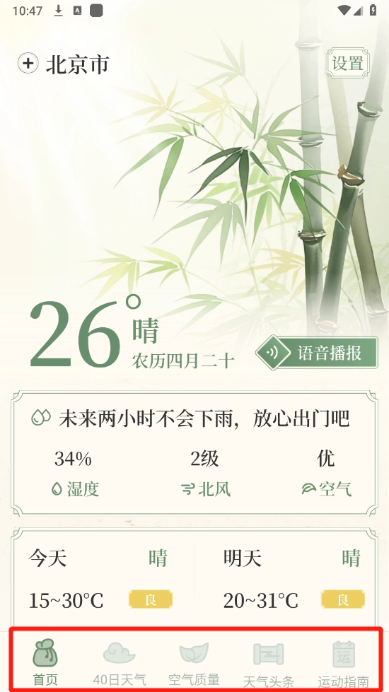 选择完毕后,会呈现出丰富多样的天气板块,像未来40日天气、空气质量以及天气头条等内容都包含在内。