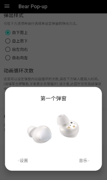 除了上方弹窗的文字内容与图片,Bear Pop-up还配备了多样的可自定义选项,涵盖弹窗背景色、文字颜色(上左右区域文字颜色、*电量显示文字颜色)、弹窗尺寸(显示长度与宽度)、弹窗展示时长、左右侧按钮的应用跳转功能、*圆角大小、*弹窗样式(方向设置)、*动画循环次数以及*电量显示开关。标注有'*'的属性属于登录授权用户方可定制的属性。