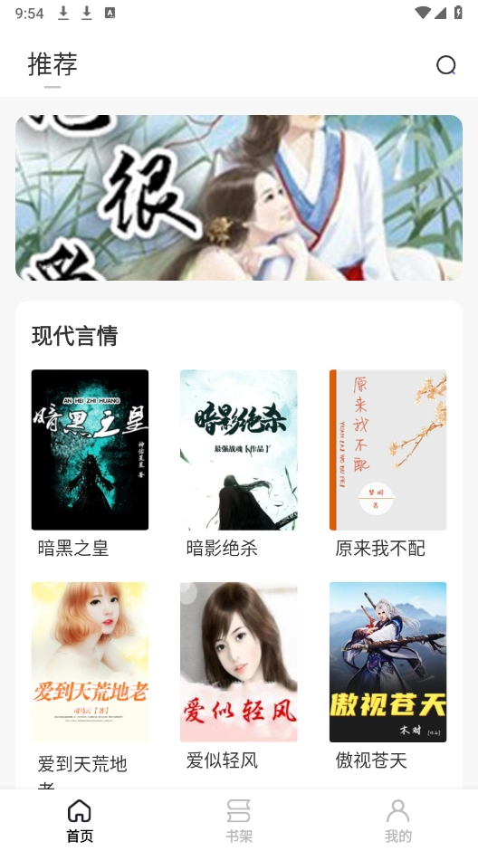 进入首页后,能看到种类丰富的小说类型,现代言情、古装、科幻等各类题材应有尽有。