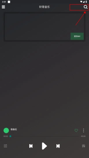 安装轩哥音乐并打开应用。进入首页后,点击右上角的“放大镜”形状的搜索图标。