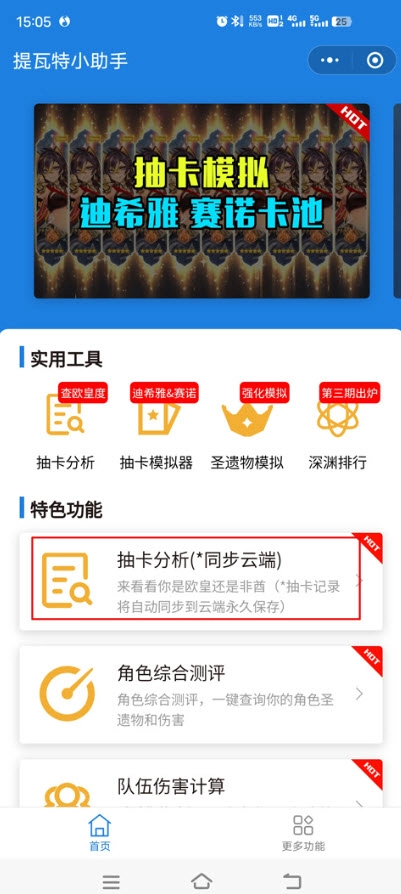 打开“提瓦特小助手”微信小程序后,点击“抽卡分析”功能选项。