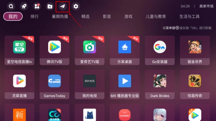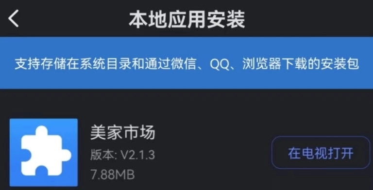 连接成功后,在小米电视助手的【本地应用】里找到之前的美家市场安装包,选择“在电视打开”就能使用美家市场应用了。