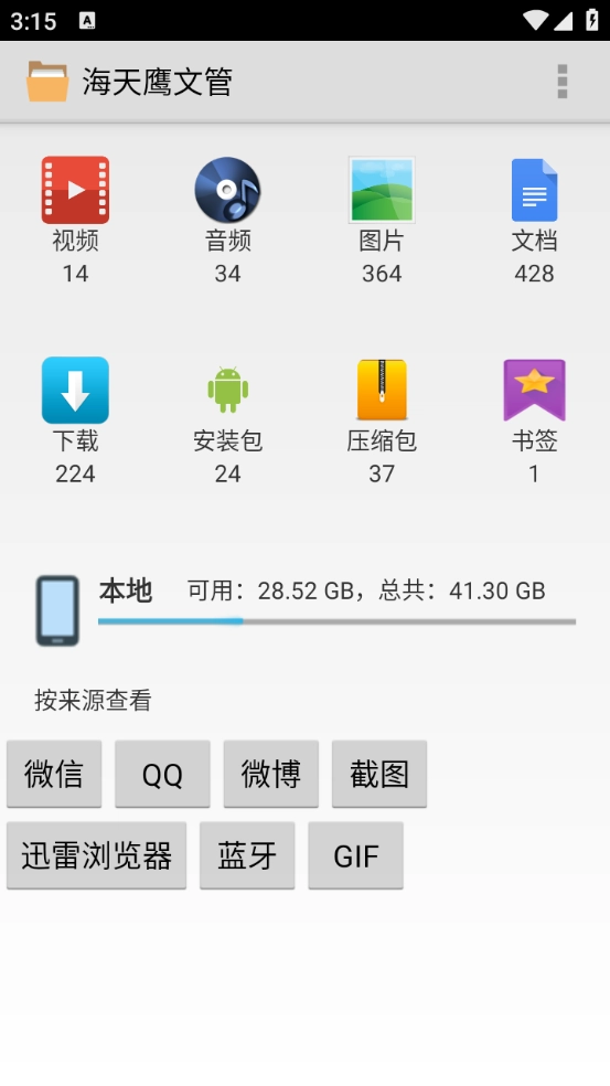 快速分类功能:可对手机中的各类文件进行快速区分,涵盖视频、音频、图片、文档、其他文件、安装包、压缩包等类型。
