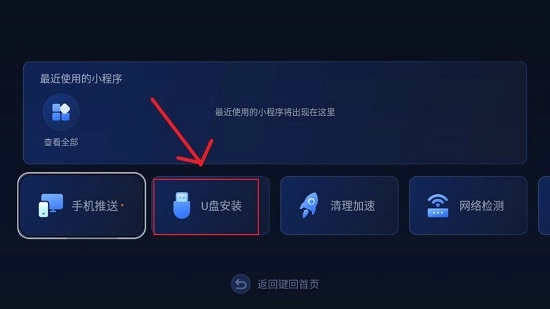 进入后,你会在界面中看到插入电视的U盘信息,找到需要安装的APK安装包进行安装就可以了。(由于本站仅作演示,并未实际插入U盘,因此当前显示“未检测到U盘”)