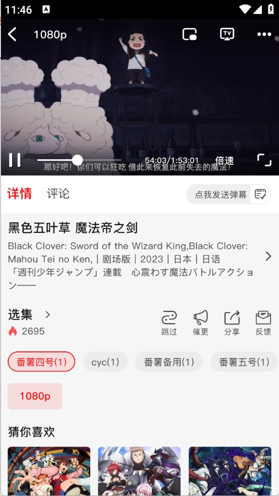 用户选定动漫并打开后,选择想要观看的集数;若播放时出现卡顿现象,或是遇到集数不全的情况,可通过切换播放源来解决。