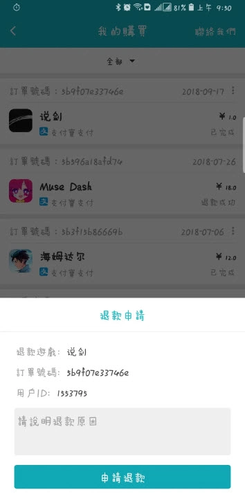 在订单管理页面能查看自己过往在TapTap购买的游戏,点击账单页右上角的按钮会弹出“申请退款”的弹框。