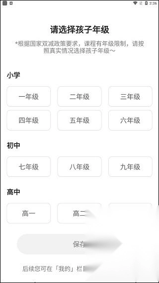 在使用软件前,请先完成注册与登录操作,随后选择孩子对应的年级。