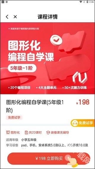 在“自学课程”板块中设有免费试学内容,进入该板块后,你可以查看课程详情介绍、课程列表,以及了解支持的学习设备和适用的年级范围。