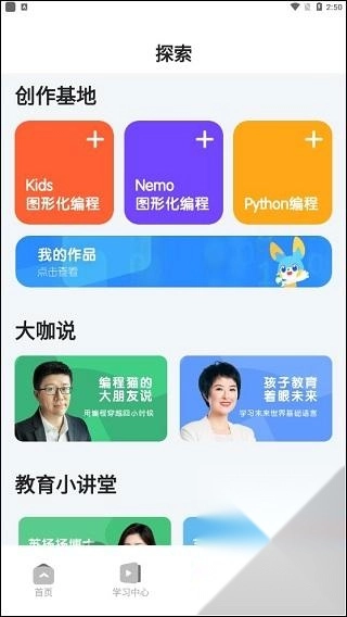 在“探索”区域,设置有编创活动、创作基地,还有漫画、小剧场、教育小讲堂、童话故事、成长动画等内容。
