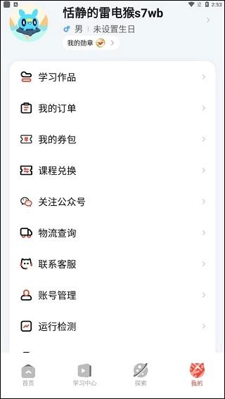 在“我的”页面(即个人中心)中,设有学习作品创建、课程管理功能,同时包含我的订单、我的券包、课程兑换等优惠福利板块;若使用过程中遇到任何问题,也可在此联系客服。